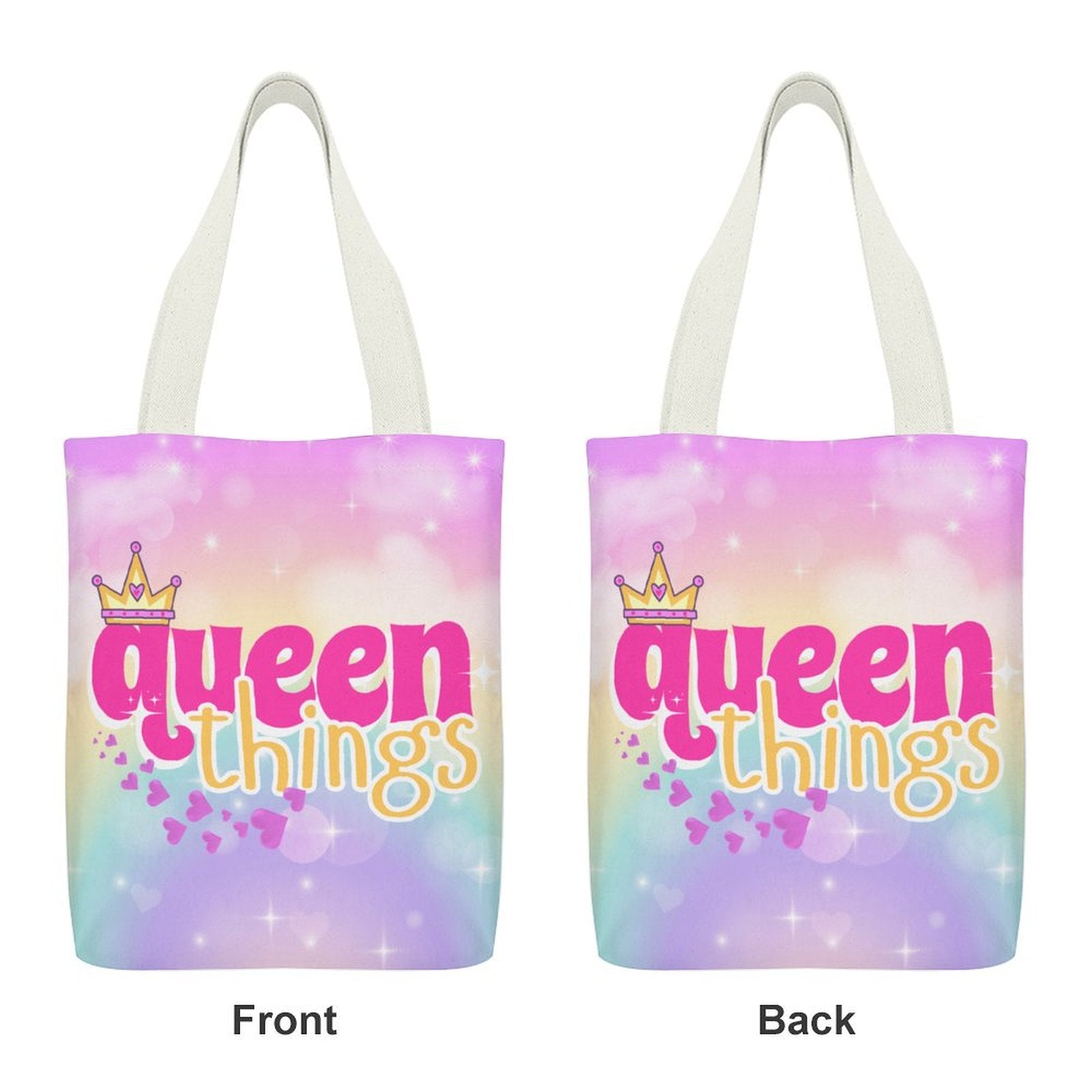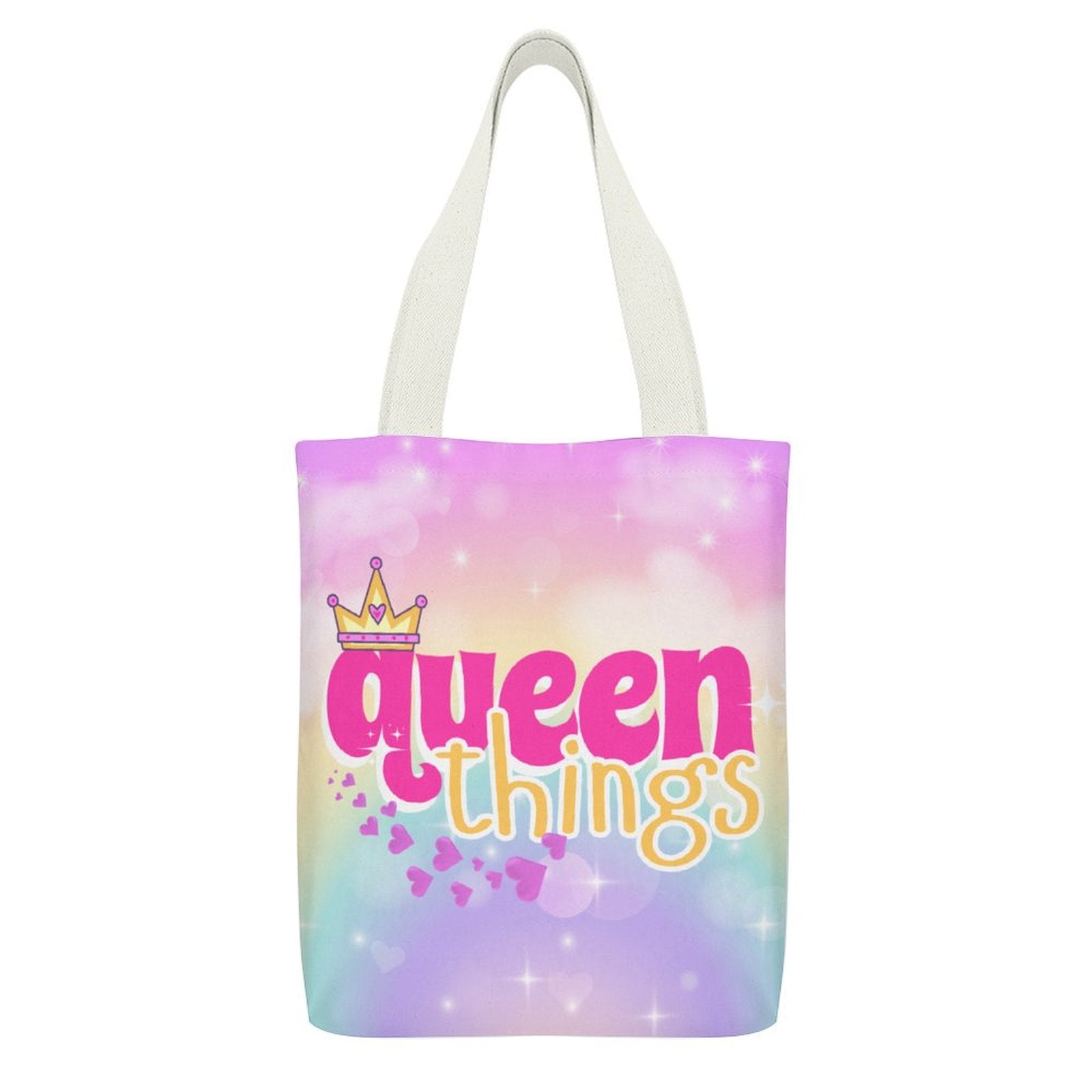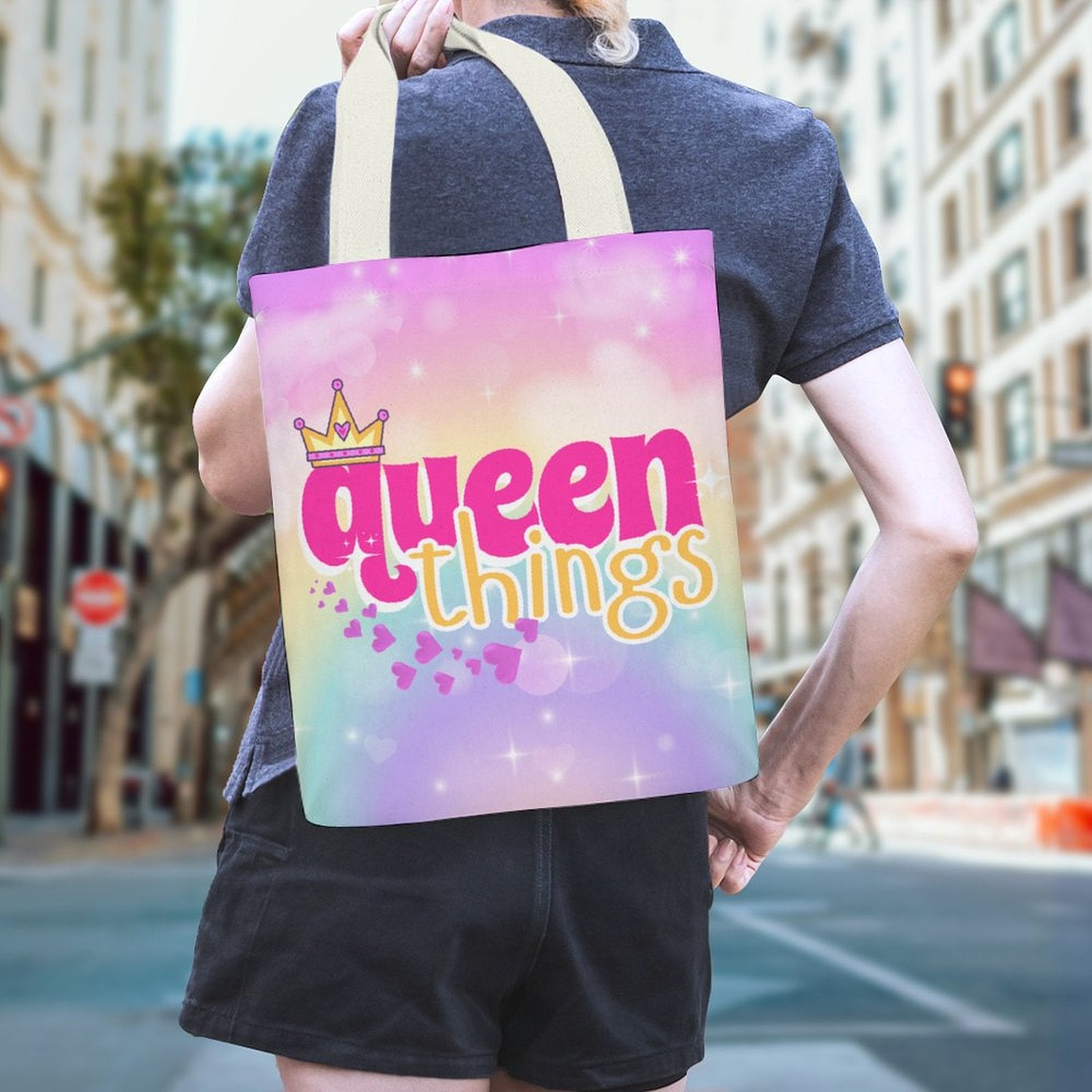 Featuring the bold “Queen Things” design front and center, this bag reminds everyone that you rule your world with grace and glow.