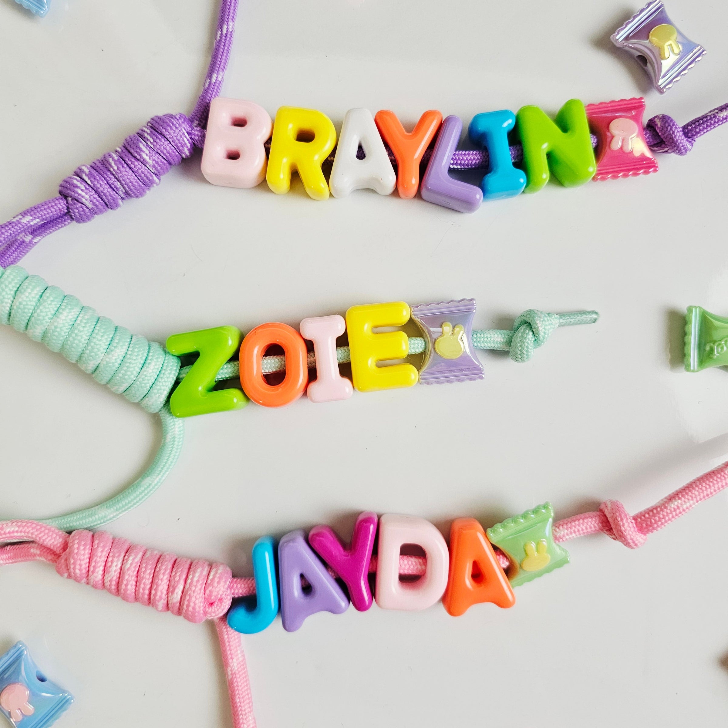 Note: Each keychain is made to order. Due to the variety of letter and rope colors, exact combinations will vary, making each piece one-of-a-kind. Candy and letter colors will be chosen randomly.